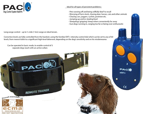 “I am more than happy to recommend the PAC remote training collar as a gentle persuader for hard to handle dogs. When I took on a rescue Springer Spaniel about three years ago, I was her fourth owner. She was out of control and a real problem. She now responds to the whistle and enjoys off-the-lead walks. There is no doubt in my mind that the collar has saved her life.”